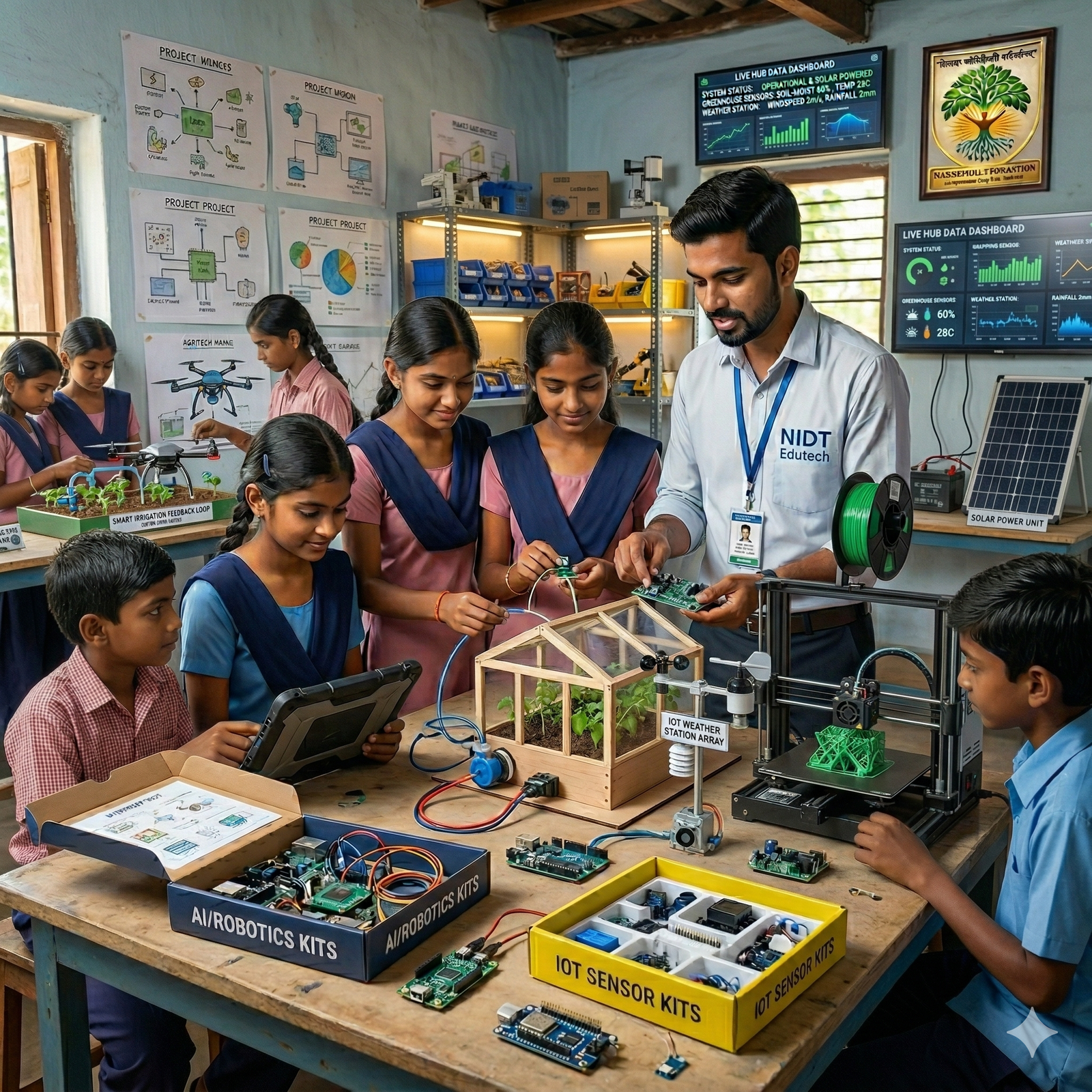 This initiative empowers rural students through AI and Robotics innovation, IPR, and Cybersecurity education, fostering safe creation and self-reliance in the digital economy.